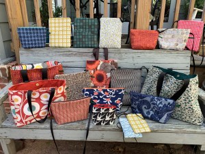 We’re giving reclaimed fabric new life – and a new bag for toiletries, jewellery, make-up, gadgets and cords….whatever needs a place to live! We use both new and recycled fabrics for zippered purses, tote bags, toiletry cases, and bags for gadgets and cords.